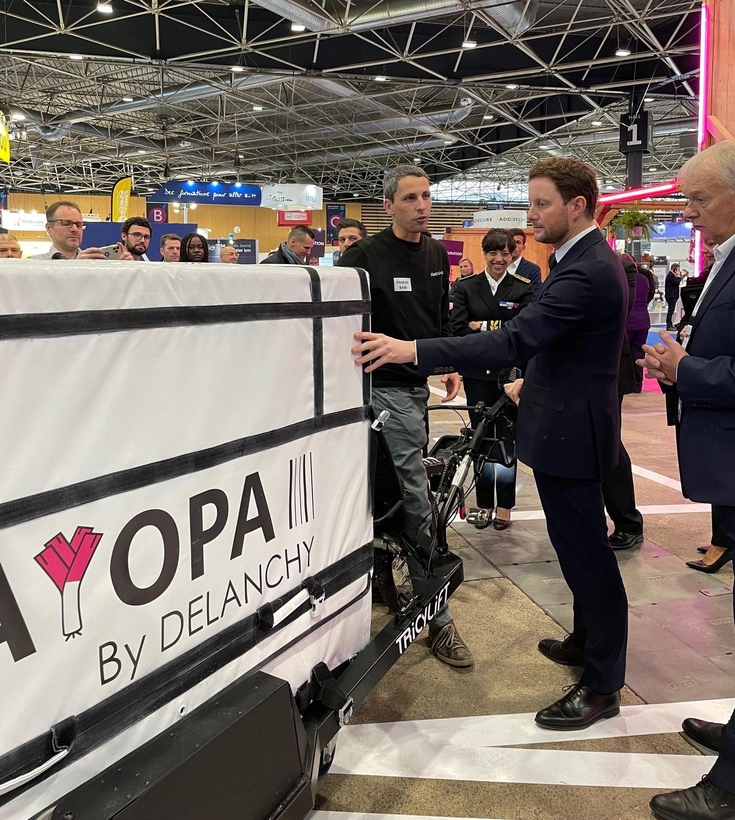 Lors de l’inauguration du salon, menée par Clément Beaune, Ministre des Transports, Charles Levillain, fondateur de FlexiModal, a pu échanger avec le Ministre sur les problématiques urbaines après démonstration du TricyLift.